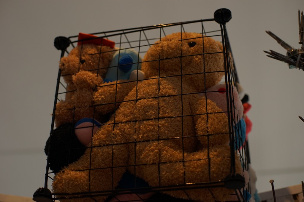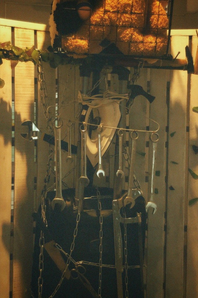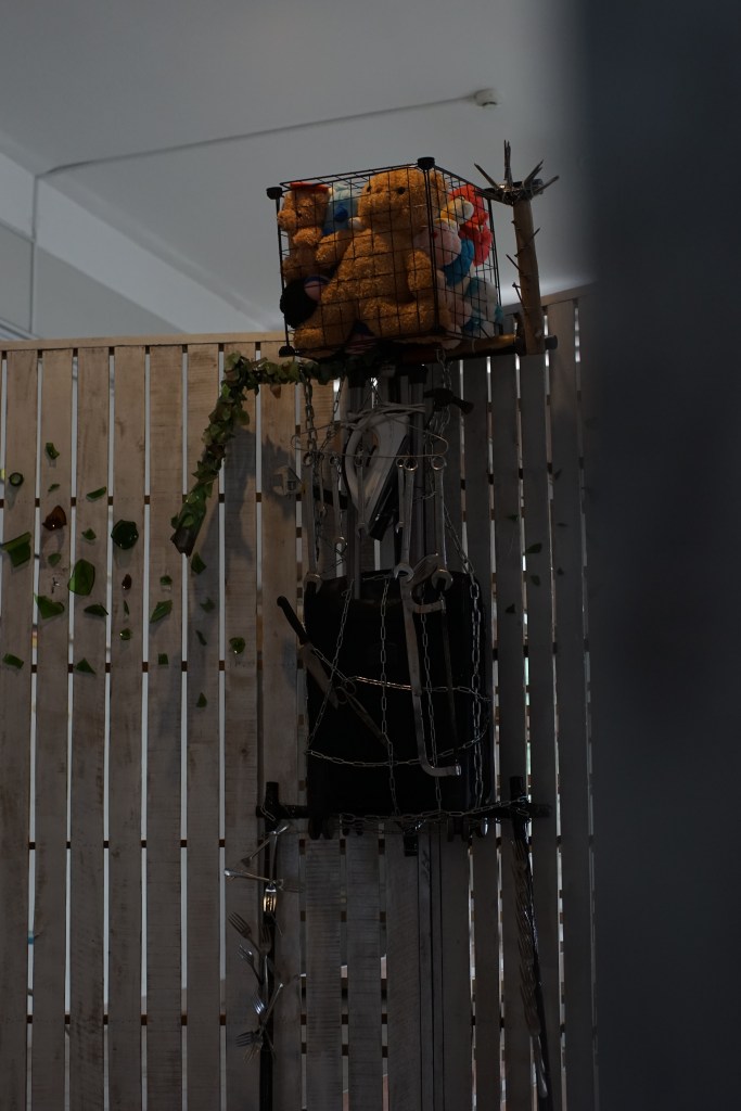 The next Installation artwork features a large robot constructed to exaggerate everyday household objects, which are also commonly used as tools of abuse, such as cages, glass bottles, hammers, nails, chains, and the like.