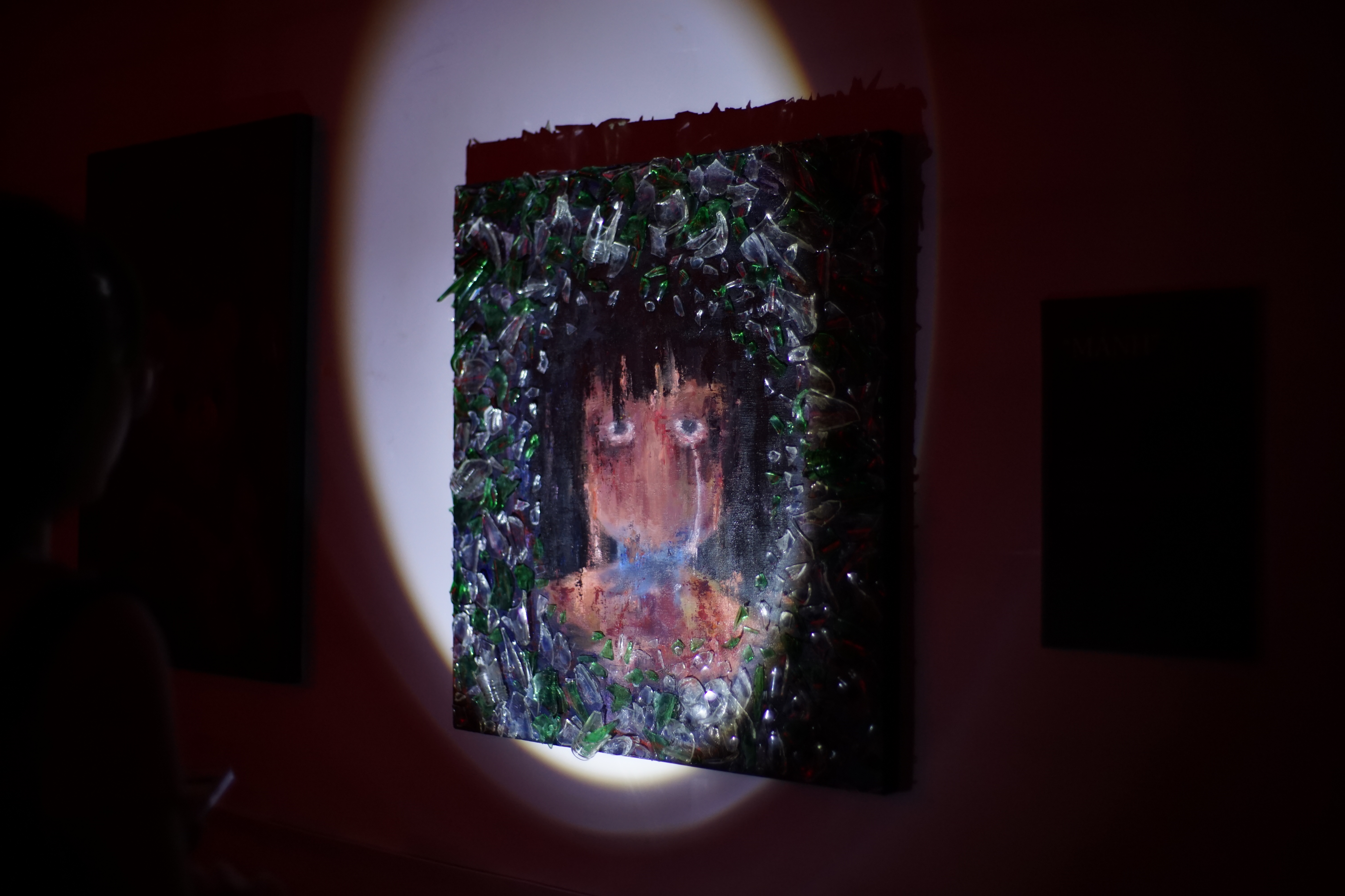 The painting depicts physical and emotional abuse, portraying a portrait of little An without a mouth, surrounded by shards of beer bottles from her stepfather.