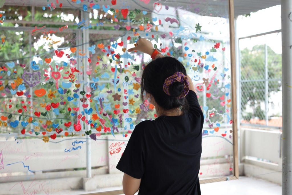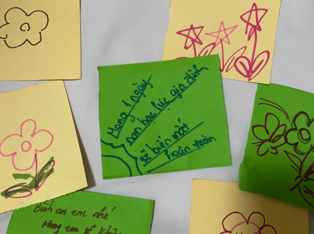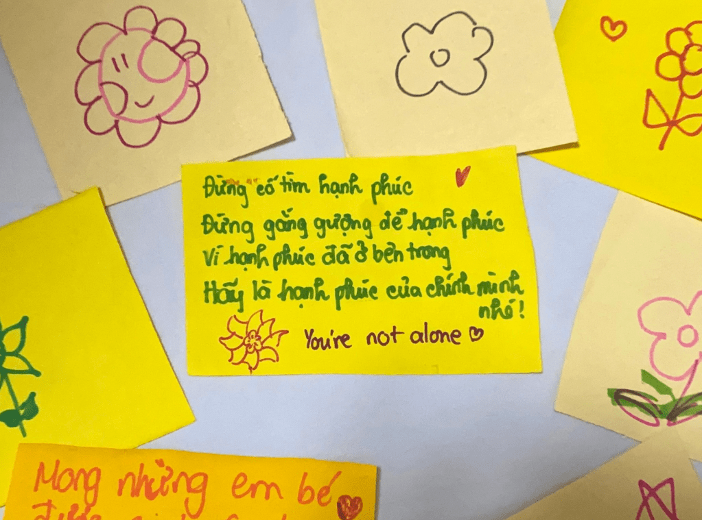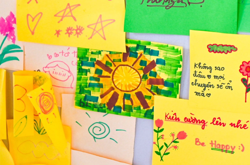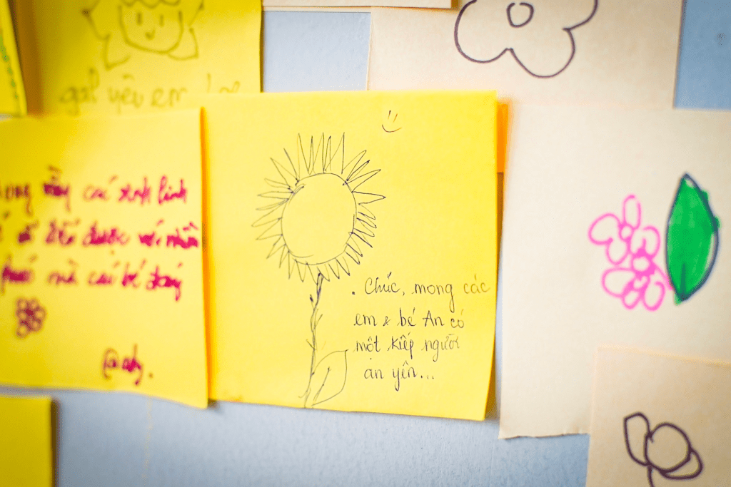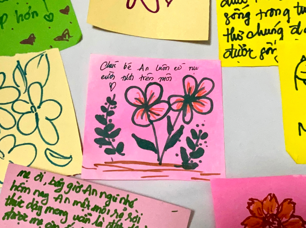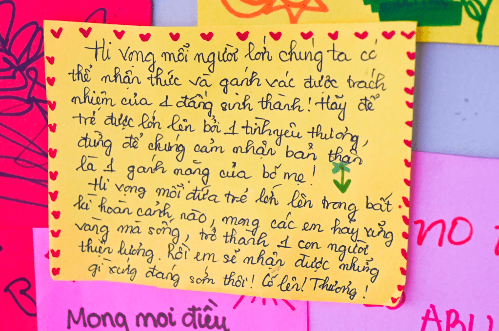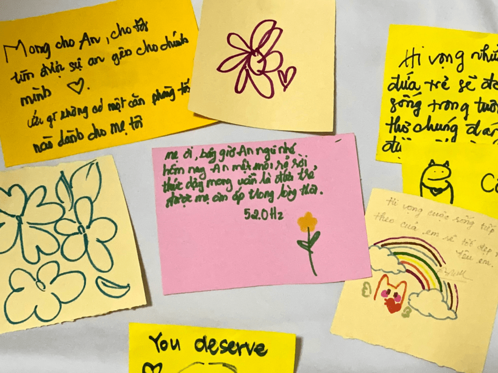 Marking the end of the “Bầm” journey is a flower dedicated to An, constructed from a wall of colorful sticky notes. Each note bears a message of hope and encouragement from visitors, addressed to An and the community, raising awareness about child abuse.