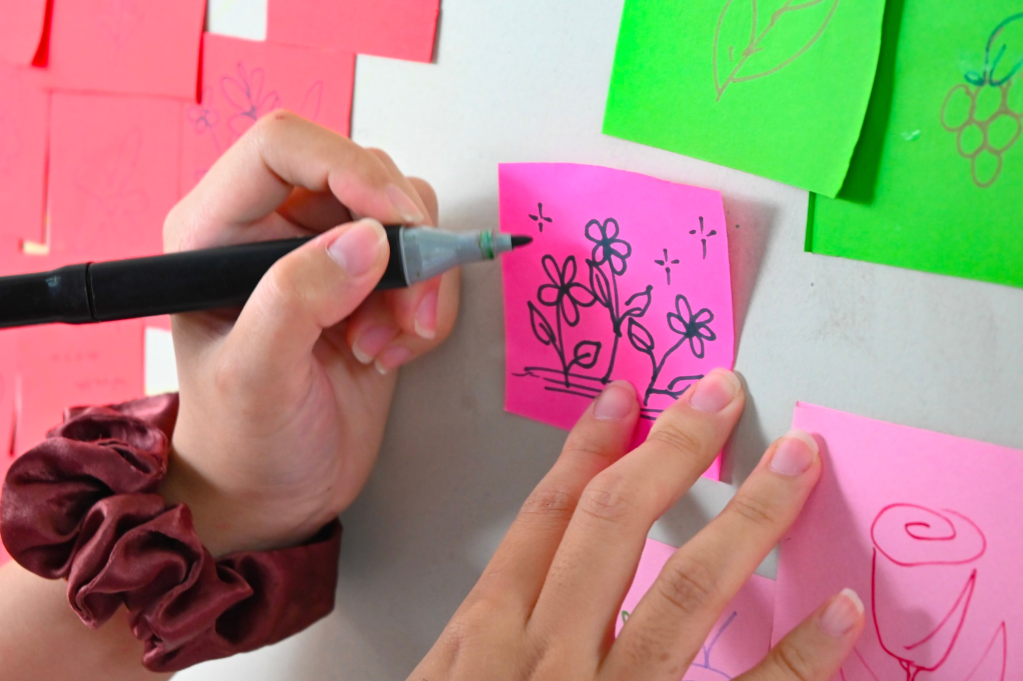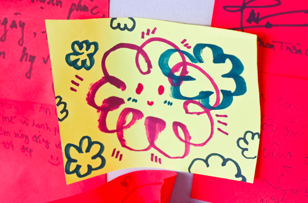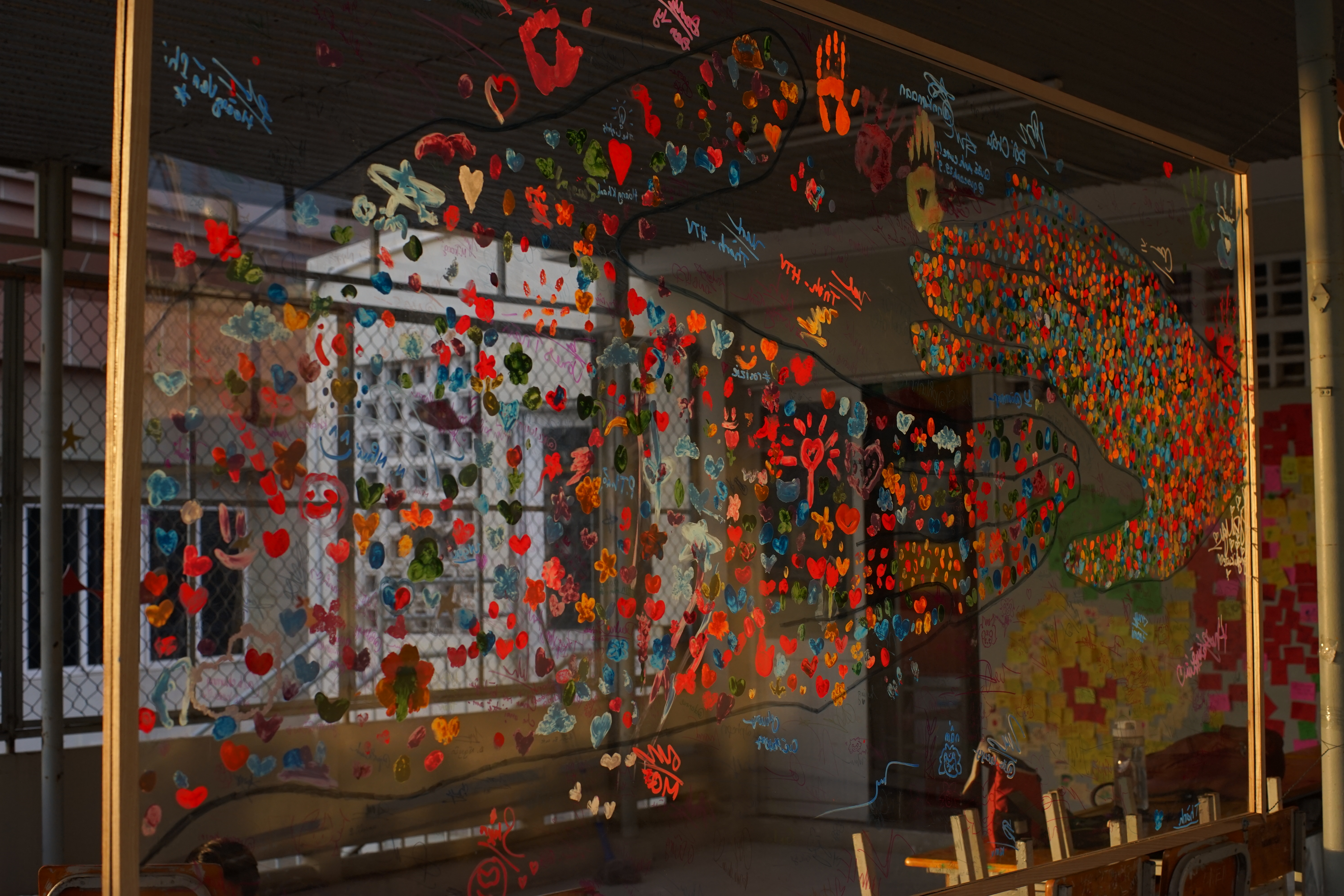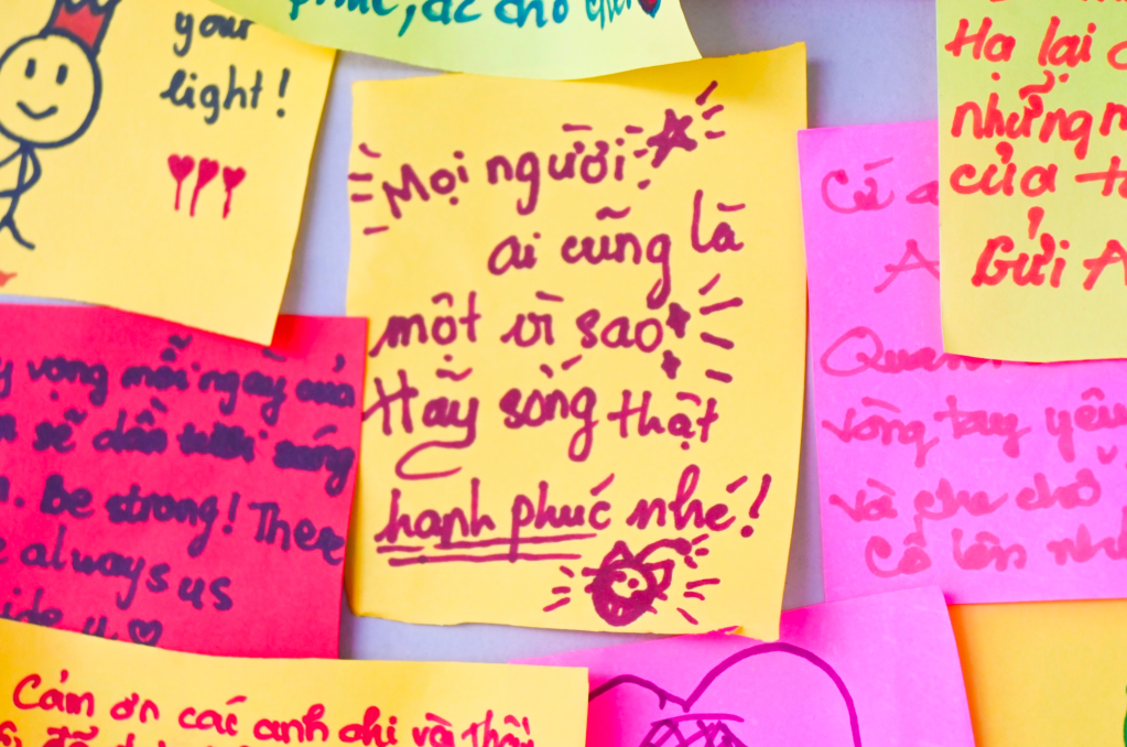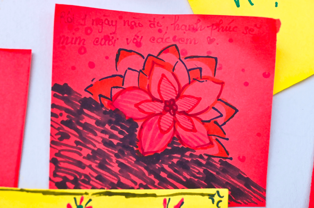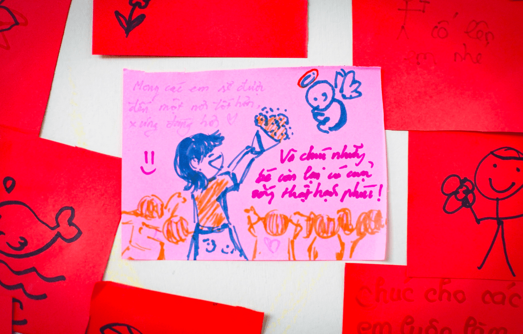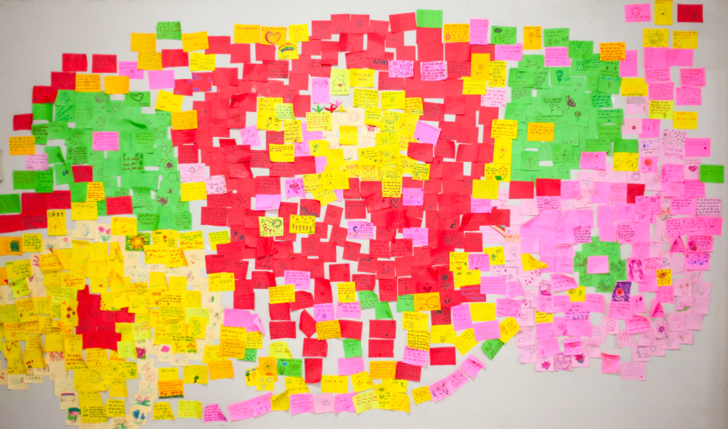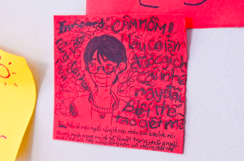 Marking the end of the “Bầm” journey is a flower dedicated to An, constructed from a wall of colorful sticky notes. Each note bears a message of hope and encouragement from visitors, addressed to An and the community, raising awareness about child abuse.