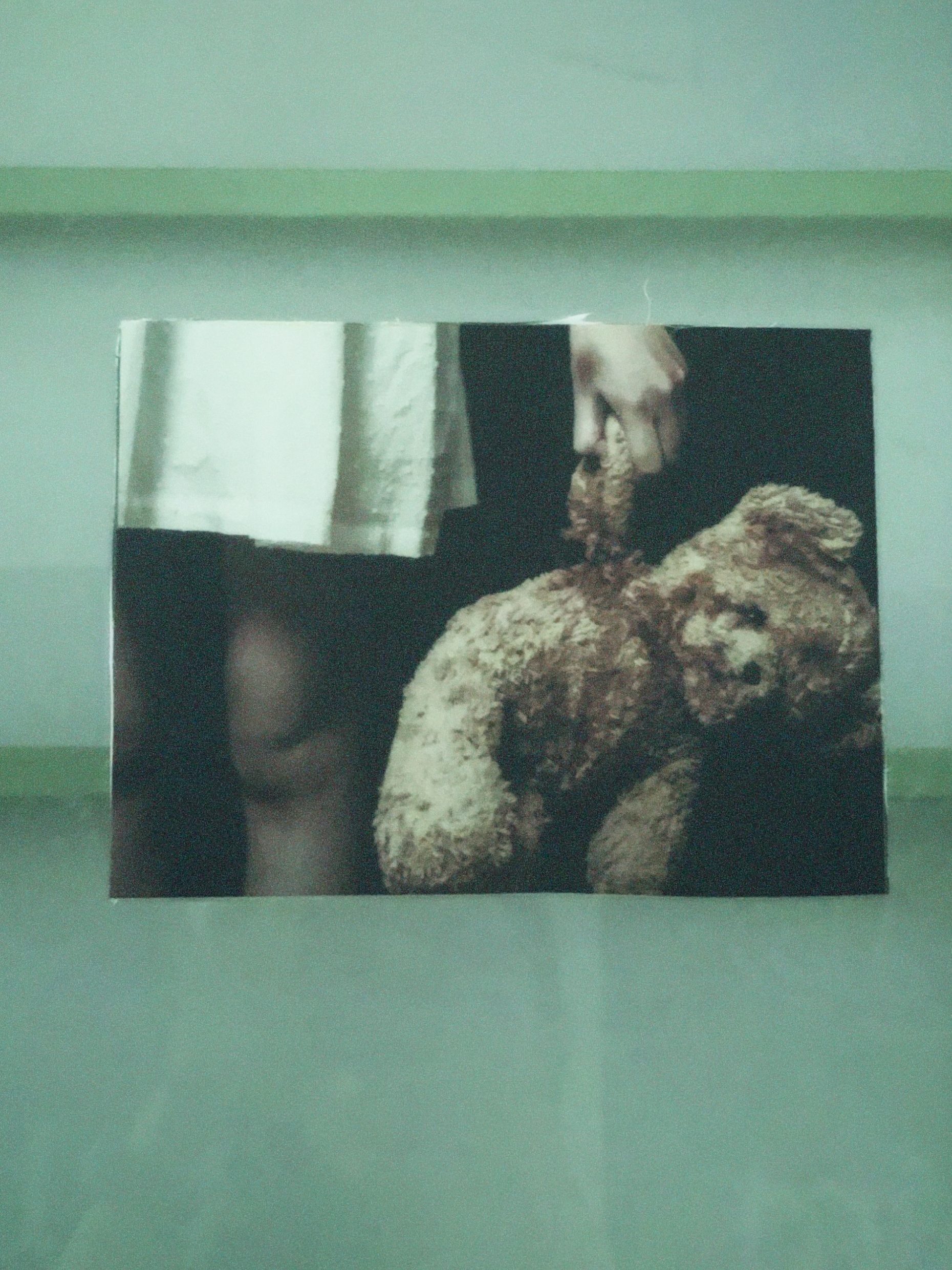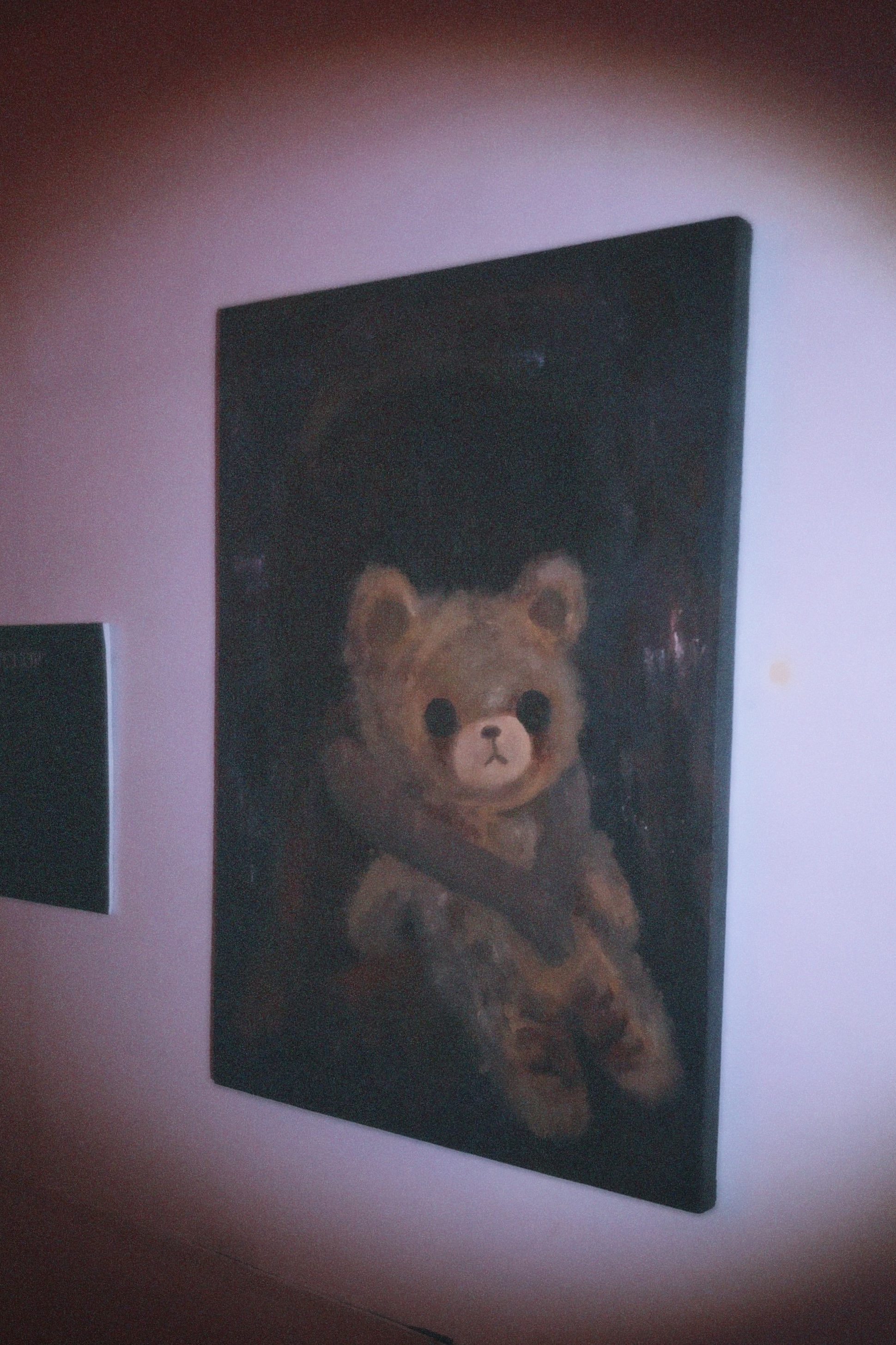 The painting about sexual abuse, with the teddy bear here as a friend and also a symbol of An’s soul, is stained with red stains.