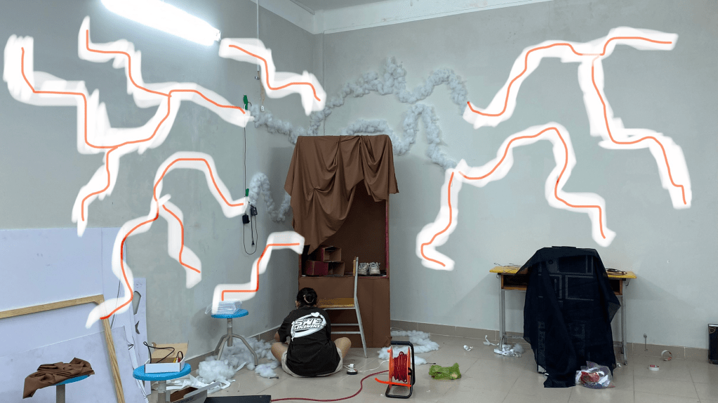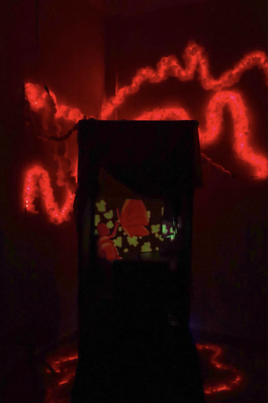 This artwork used Installation Art, Spatial lighting and Motion graphics to recreate the setting of an old wardrobe, a place where An often seeks refuge from her abusive family environment. It represents a sanctuary for An, a place where she can rest, be herself, and indulge in imaginative dreams like any other child. Here, An’s imaginary friend, a butterfly, emerges as a beacon of light, offering solace and hope for her troubled soul