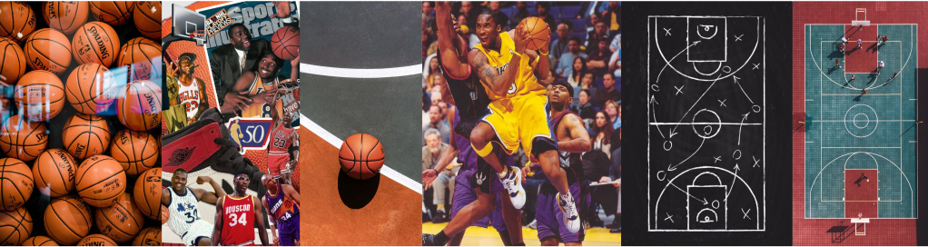 The iconic red basketball shape serves as the focal point, while torn paper scraps, bold brushstrokes, and collaged textures create a sense of urgency and excitement.